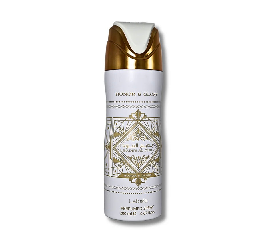Launch year: 2023. Fragrance Family: Amber Spicy. Top notes: Pineapple and Creme Brulee. Heart notes: Benzoin, Cinnamon, Turmeric and Black Pepper. Base notes: Vanilla, Sandalwood, Cashmeran and Moss. Design house: Lattafa. Design house category: middle eastern fragrance. Design house country: United Arab Emirates. Scent name: Bade'e Al Oud Honor & Glory. Gender: Unisex. Category: Fragrance. SubType: Gift Set. Barcode: 6290362340010. Set Lattafa 3Pc Bade'E Al Oud Honor And Glory 3.4 Edp+6.67 Deo+1.7 Hair Mist (U) Soft Display Box. Lattafa Unisex Bade'e Al Oud Honor & Glory Gift Set Fragrances 6290362340010